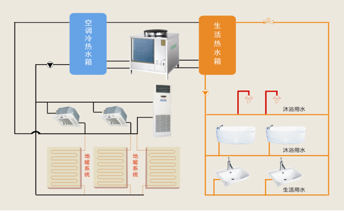 華源空氣能采暖系統(tǒng),將空氣能熱泵與家用地暖或者風(fēng)機(jī)盤管(立式或者吊頂)相結(jié)合,提供所需熱量,另外系統(tǒng)產(chǎn)生的熱水可用于家庭洗浴、生活用熱水的供應(yīng),實(shí)現(xiàn)冬季采暖與全年熱水供應(yīng)的結(jié)合,建造全套家庭(單位)熱水中心。