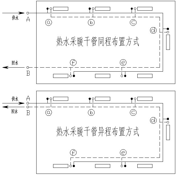 2、而在下圖的異程系統中,供水與回水主管中熱媒的流動方面則是一致的。供水由A點起經a立管至B點的距離遠大于由A點經f點立管至B點的距離,將產生各環路阻力不平衡的現象,設計人員通常會采用選擇管徑和設調節閥門等措施來降低這種不平衡的弊端,如果不采用這些措施,必然會造成從a立管向f立管散熱量逐次降低的問題。盡管從理論上看,異程系統不如同程系統來得合理,但由于異程系統回水主管簡短,在一定程度上節約了初投資,而且在施工時可以采用共架敷設(因供回水主管坡向一致),易于施工,所以實際采用較多。
